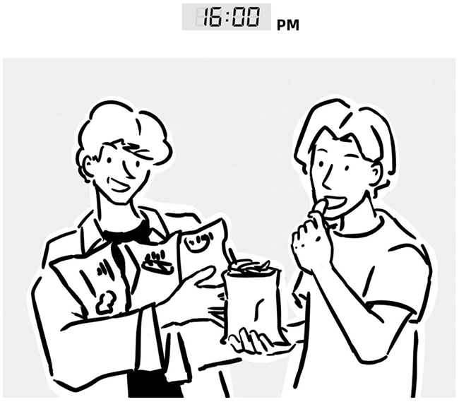 Simon和James作为办公室邻桌,友谊的桥梁是靠零食建立的,从好物下单到点评味道,越来越默契。也不小心实现了一年一起增肥10斤的“效果协同”。